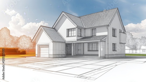 A digital rendering of a modern house design showcasing architectural features.