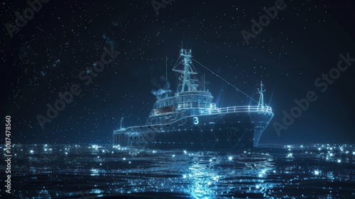 A digital rendering of a ship, composed of lines of light, sailing across a dark, digital sea under a starry sky.