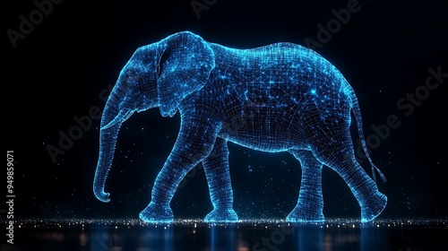 A digital rendering of an elephant in a blue glowing wireframe style.