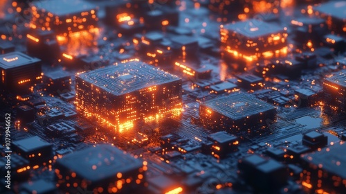 A digital rendering of blockchain data flowing through transparent cubes, interconnected in a glowing grid, blokchain. chip