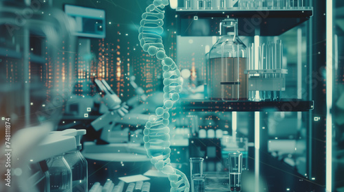 A digital representation of a DNA molecule within the futuristic environment of a high-tech research laboratory.