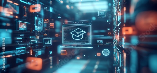 A digital representation of education with data visualizations and a graduation cap.