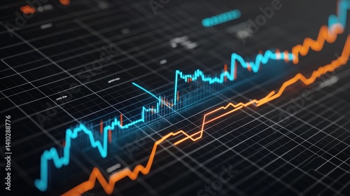 A digital representation of fluctuating financial graphs with colorful lines indicating market trends and data analysis.
