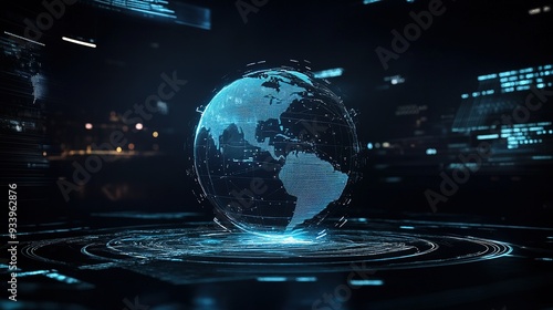 A digital representation of the Earth with glowing lines and data points, surrounded by futuristic technology in a dark setting, illustrating global connectivity and innovation