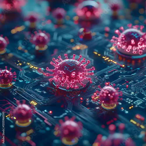 A digital representation of viruses interacting with circuit board technology. Suggests a cyber attack or data breach scenario.
