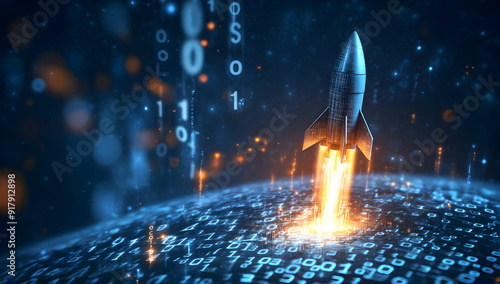 A digital rocket launch representing innovation and technology, symbolizing advancement and exploration in the digital age.
