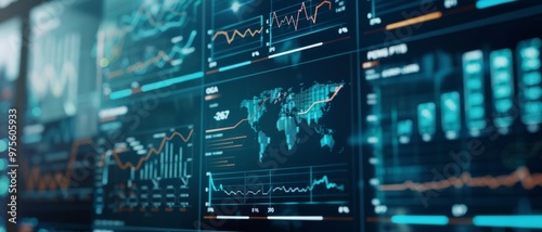 A digital screen filled with global financial data, including stock market trends and world maps, indicates an intensive focus on international trade and economics.