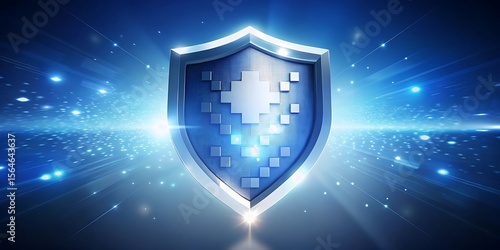 A digital shield glows with cybernetic patterns, representing data security and protection.