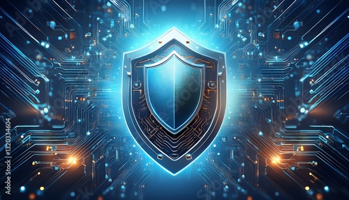 A digital shield symbolizing cybersecurity, surrounded by glowing circuits, representing protection and technology.