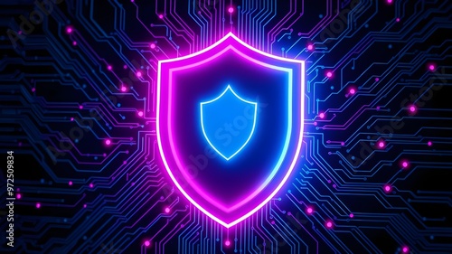 a digital shield with a keyhole at its center, representing cybersecurity and data protection in a vibrant, neon-colored design, surrounded by circuits.