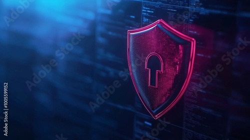A digital shield with a keyhole, illuminated in pink, symbolizes cybersecurity and data protection against digital threats.