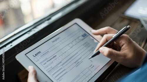 A digital tablet displaying a registration form with sections for name, email, phone number, and date of birth, being filled out by a user.