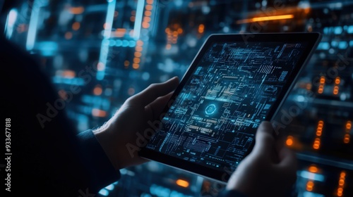 A digital tablet showcases blockchain technology and data encryption, with a businessman utilizing AI