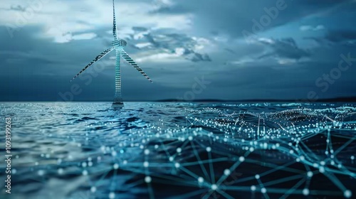 A digital windmill in an ocean at night, surrounded by stars and clouds, with a networked environment reflected below. Additional turbines suggest a sea wind farm scene.