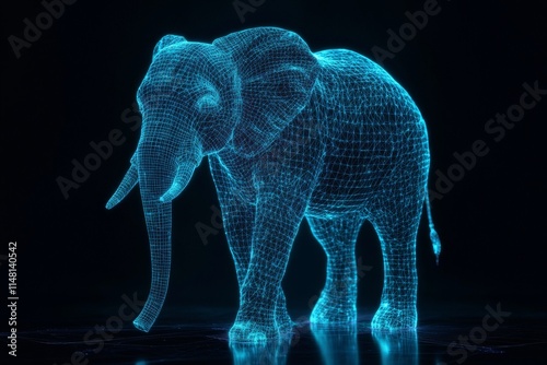 A digital wireframe model of an elephant glowing in neon blue against a dark background, showcasing futuristic technology.