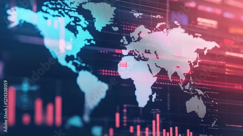 A digital world map overlaid with data metrics and graphs, showcasing technology and globalization in a visually engaging manner.