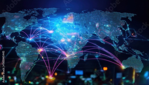 A digital world map visualizing global connectivity with vibrant data streams and network lines illustrating communication across continents.