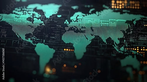 A digital world map with a dark background, composed of cyan pixels, surrounded by data charts and statistical graphics, showcasing global data analysis and a technological vibe.