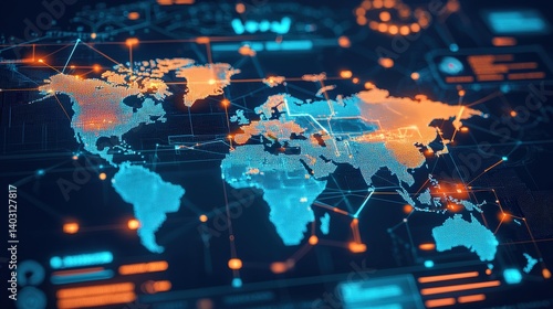 A digital world map with interconnected nodes and glowing elements, showcasing global networks and data flow in a futuristic style.