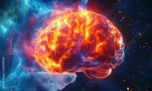 A digitally enhanced image of a brain glowing with intense fiery colors, symbolizing creativity, intelligence, and the dynamics of human thought and emotion.