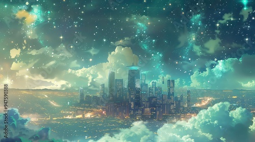 A digitally painted illustration depicting a futuristic city with tall skyscrapers bathed in starlight, with clouds obscuring the lower portion of the cityscape.