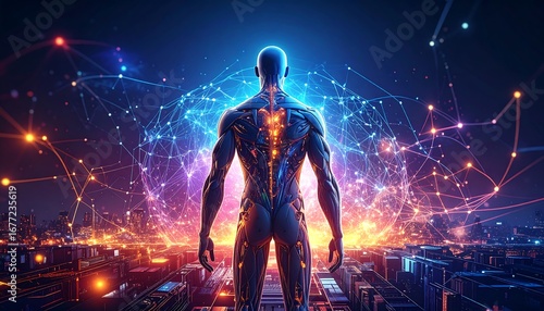 A digitally rendered figure, showcasing the intricate structure of the human anatomy, stands amidst a futuristic cityscape, illuminated by vibrant, glowing networks of light.
