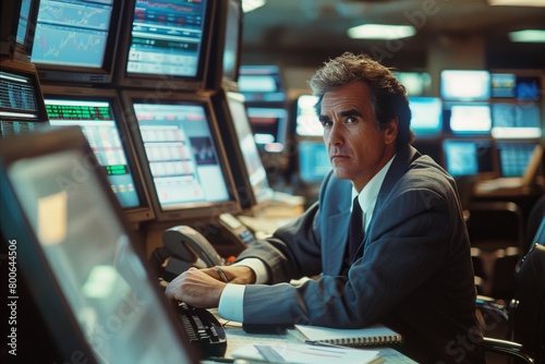 A diligent financial advisor analyses market trends at his desk with a serious expression and focus