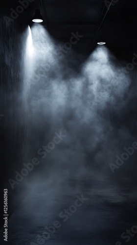 A dimly lit corridor with beams of light cutting through dense smoke, creating an eerie atmosphere.
