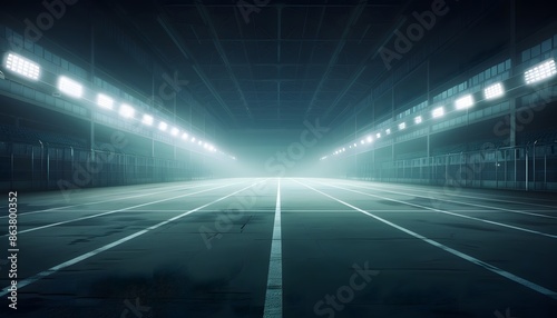 A dimly lit, empty race track