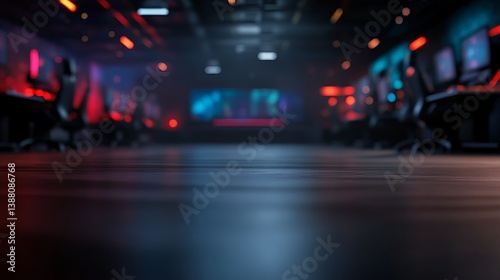 A dimly lit eSports arena featuring gaming stations with colorful neon lights, creating an immersive atmosphere.