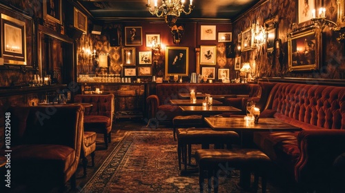 A dimly lit lounge with velvet seating, wooden tables, and candlelight.