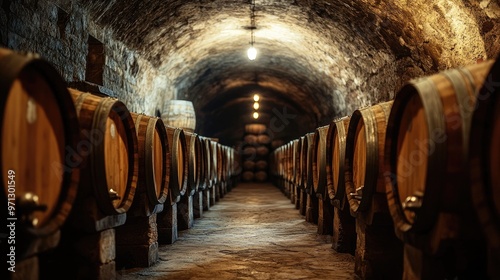 A dimly lit wine cellar with rows of old wooden barrels, capturing the atmosphere of aging wine in a historic setting