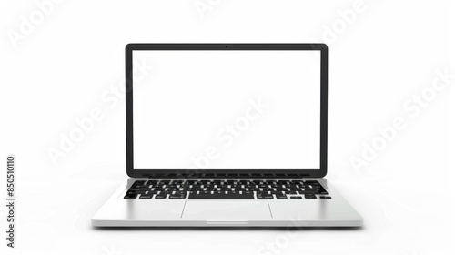 A directly front-facing image of an open laptop displaying a white screen, set against a white backdrop