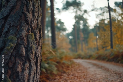 A dirt road in the woods with a tree in the foreground, suitable for outdoor and nature scenes