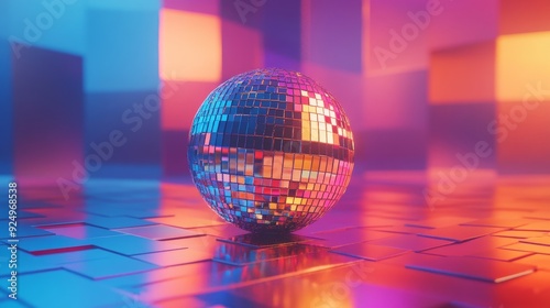 A disco ball reflects colorful lights in a dark room, creating a vibrant and energetic atmosphere.