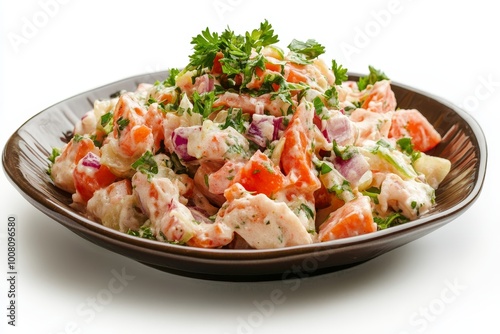 A dish of chicken salad with mayonnaise, including shrimp and vegetables on a white background.