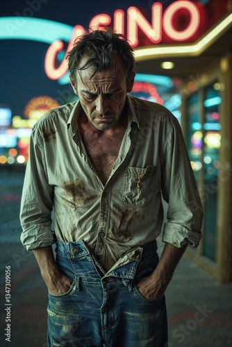 A disheveled man dressed in torn clothes stands alone outside a brightly lit casino. He appears lost in thought, contemplating the consequences of his bad habits in the nightlife