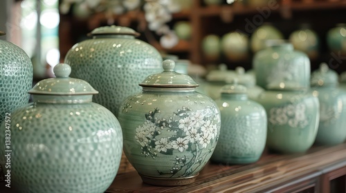 A display of decorative ceramic jars with floral designs in a serene setting.