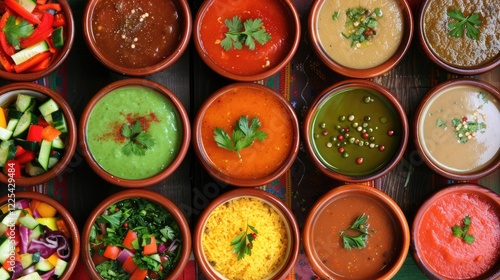 A display of different bowls with tasty soup and colorful, freshly-cut veggies.