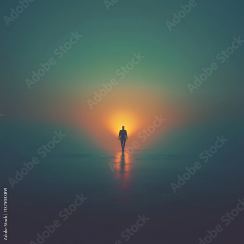 a distant silhouette of a person walking into a glowing sunrise, slight fog, dreamlike environment, sleek futuristic minimalism, clean gradients, soft color palette, cinematic atmosphere