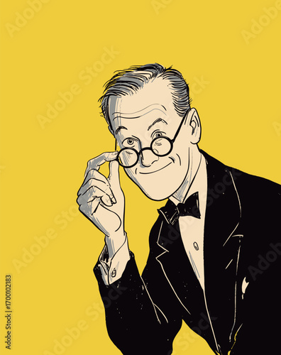 A distinguished man in a tuxedo playfully adjusts his round glasses while smiling. The bright yellow background adds a cheerful and lively atmosphere to his classy appearance.