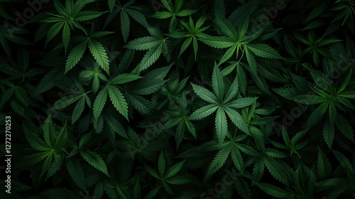 A diverse arrangement of cannabis leaves fills the frame, featuring various shades of green and unique shapes. This display highlights the plant's natural beauty and texture.