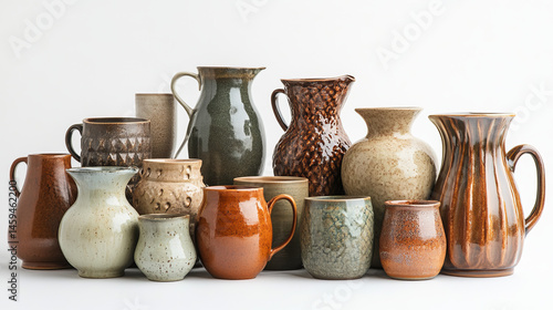A diverse collection of brown ceramic pitchers and mugs of various shapes and sizes arranged together