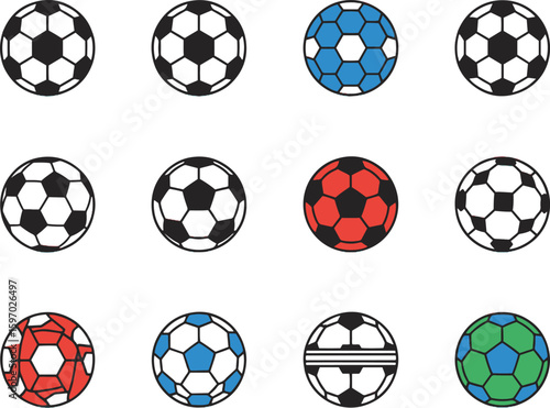 A diverse collection of colorful and creative soccer ball icons featuring classic black-and-white styles, geometric patterns, vibrant color schemes, abstract textures, and modern design variations.