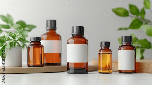 A diverse collection of elegantly designed amber bottles sits on a wooden surface, ideal for highlighting beauty products and essential oils in a serene setting.