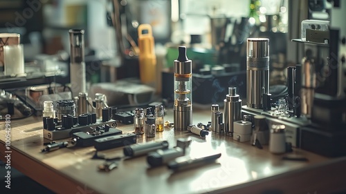 A diverse collection of vaping devices, e-liquids, and accessories displayed on a wooden table, featuring intricate details and designs.