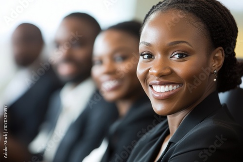 A diverse group of black professionals are engaged and smiling during a presentation at the office. Their positive expressions radiate enthusiasm and teamwork, creating an uplifting atmosphere.