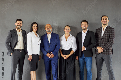 A diverse group of business people stand in a row against studio gray background, expressing unity and confidence for branding. Professional employees team posing for corporate portrait.