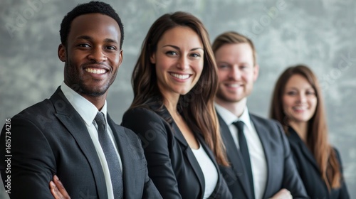 A diverse group of business professionals standing in a row, dressed in formal attire. The individuals are smiling and appear to be in a professional setting.