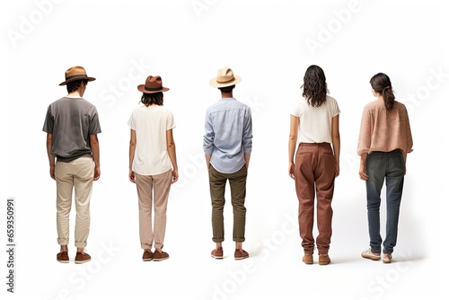 A diverse group of confident young people, standing together, viewed from behind in a studio portrait.